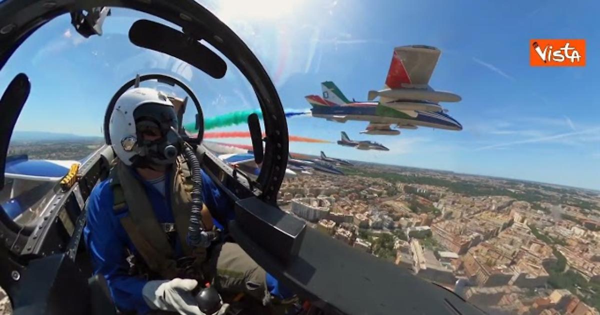 Il volo delle Frecce Tricolori sui fori Imperiali per la parata del 2 Giugno visto dalla prospettiva del pilota.