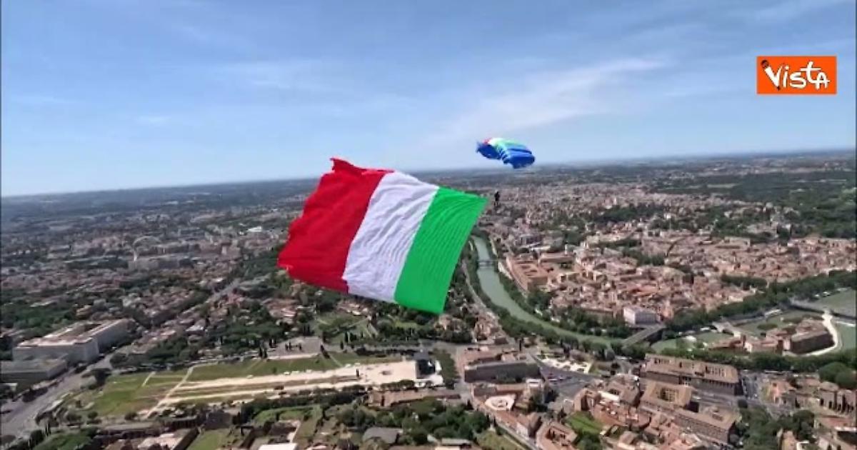 L'esibizione dei paracadutisti su Via dei Fori Imperiali alla parata del 2 Giugno vista dall'elicottero.