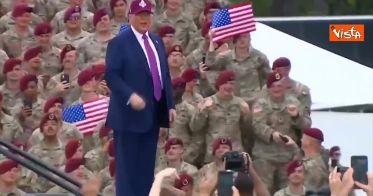 Trump a Fort Bragg, base militare nella Carolina del Nord, per festeggiare il 250esimo anniversario della nascita dell'esercito Usa. Eccolo alle prese con l'iconica Trump dance sulle note di Ymca tra le truppe.