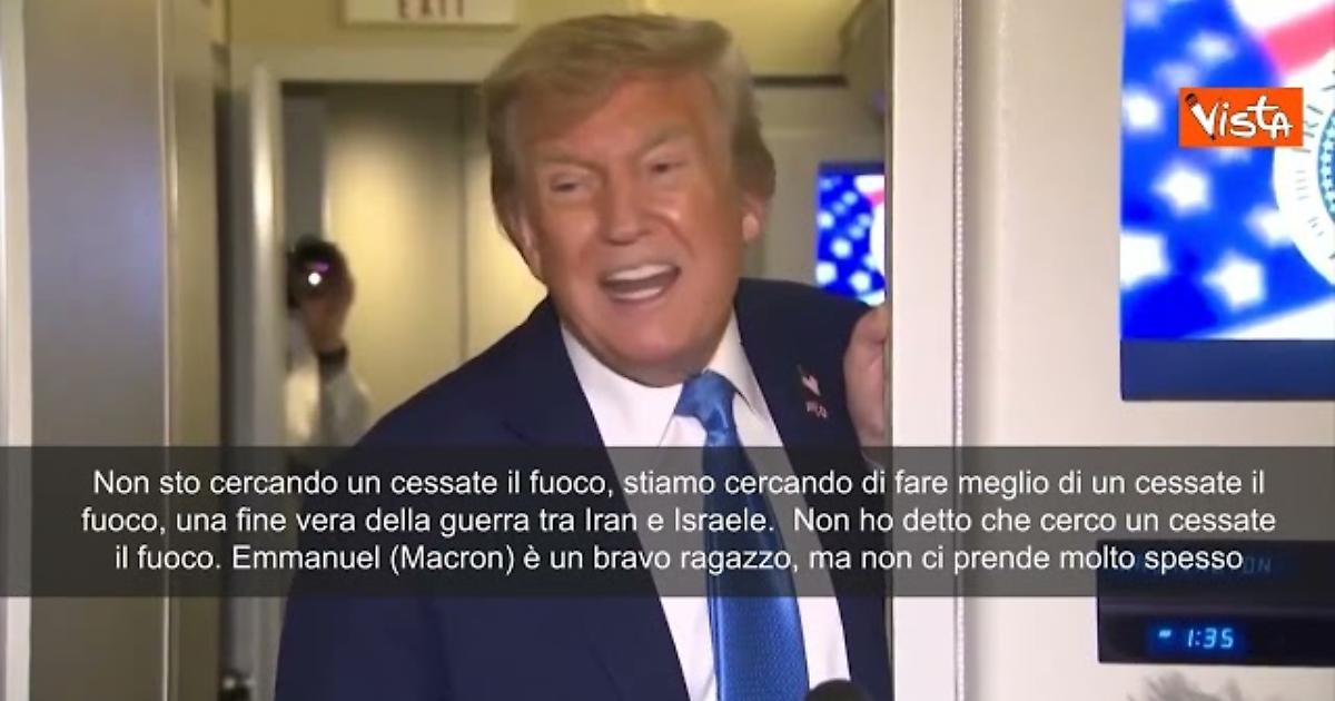 "L'Iran non può avere un'arma nucleare. È molto semplice: non c'è bisogno di approfondire troppo la questione. Semplicemente non possono avere un'arma nucleare. Non sto cercando un cessate il fuoco, stiamo cercando di fare meglio di un cessate il fuoco, una fine vera della guerra tra Iran e Israele. Non ho detto che cerco un cessate il fuoco. Emmanuel (Macron) è un bravo ragazzo, ma non ci prende molto spesso”. Lo ha detto il presidente americano, Donald Trump parlando con i giornalisti a bordo dell'Air Force One dopo essere atterrato a Washington dal G7 in Canada.