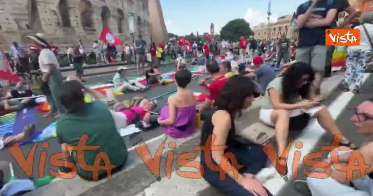 Il corteo contro il riarmo organizzato a Roma è partito da Porta San Paolo e si è conclusa davanti al Colosseo, dove i manifestanti si sono sdraiati su teli bianchi per richiamare simbolicamente le vittime del conflitto a Gaza.
