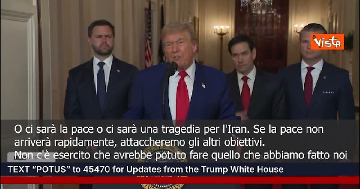 “Se la pace non arriverà rapidamente, attaccheremo gli altri obiettivi con precisione, velocità e abilità. La maggior parte di essi può essere eliminata in pochi minuti.” Così il Presidente degli Stati Uniti Donald Trump dopo aver annunciato di aver attaccato tre siti nucleari in Iran.