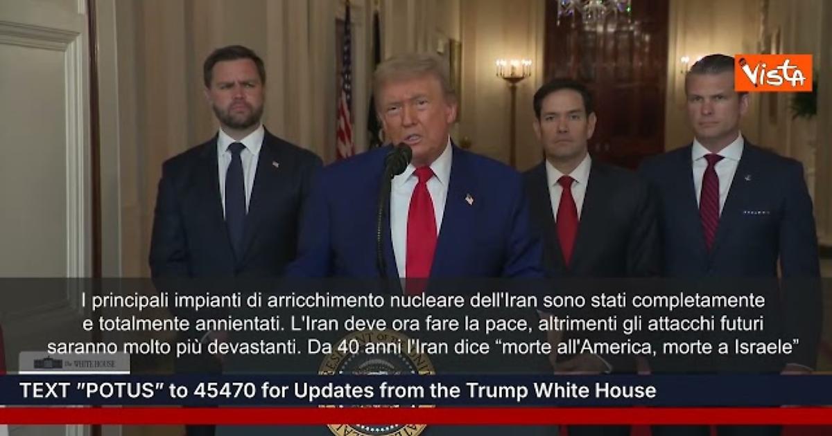 "Pochi minuti fa fa l'esercito Usa ha effettuato massicci attacchi di precisione sui tre principali impianti nucleari del regime iraniano nei pressi di Natanz ed Esfahan. Tutti hanno sentito questi nomi per anni, mentre si costruivano questi impianti orribilmente distruttivi. Il nostro obiettivo era la distruzione della capacità di arricchimento nucleare dell'Iran e lo stop alla minaccia nucleare posta dallo stato sponsor numero uno al mondo del terrorismo. Stasera posso riferire al mondo che gli attacchi sono stati un successo militare spettacolare. I principali impianti di arricchimento nucleare dell'Iran sono stati completamente e totalmente annientati. L'Iran deve ora fare la pace, altrimenti gli attacchi futuri saranno molto più devastanti. Da 40 anni l'Iran dice “morte all'America, morte a Israele”. Hanno ucciso la nostra gente facendogli saltare le braccia e le gambe, con bombe lungo la strada. Era la loro specialità. Abbiamo perso più di mille persone e centinaia di migliaia in tutto il Medio Oriente e nel resto del mondo sono morti come diretta conseguenza del loro odio. In particolare tanti sono stati uccisi da loro generale Qasem Soleimani, che ho deciso molto tempo fa di eliminare. Voglio ringraziare e congratularmi con il premier Bibi Netanyahu, abbiamo lavorato come una squadra, come forse nessuna squadra ha mai funzionato prima. C’è molta strada da fare per eliminare questa orribile minaccia contro Israele voglio ringraziare i militari israeliani per lo splendido lavoro che hanno fatto e soprattutto voglio congratularmi con i grandi patrioti americani che pilotavano quelle magnifiche macchine. Un'operazione del genere il mondo non l'ha mai vista per molti decenni e si spera, non ne avremo più bisogno. Voglio congratularmi con il Capo di Stato Maggiore Generale Dan Razin Caine e tutte le brillanti menti militari coinvolte. Adesso ci dovrà essere la pace o ci sarà una tragedia per l’Iran molto più grande di quella a cui avete assistito negli ultimi otto giorni. Ci sono molti obiettivi rimasti. L'operazione di stasera è stata la più difficile e forse la più letale, ma se la pace non arriva rapidamente noi inseguiremo gli altri obiettivi con precisione, velocità e abilità. La maggior parte di questi obiettivi possono essere aggiunti in pochi minuti. Domani il generale Kaine e il segretario Hegseth terranno una conferenza stampa. Grazie, Dio benedica Israele e Dio benedica l'America". Lo ha detto Donald Trump alla Casa Bianca dopo l'attacco contro l'Iran.