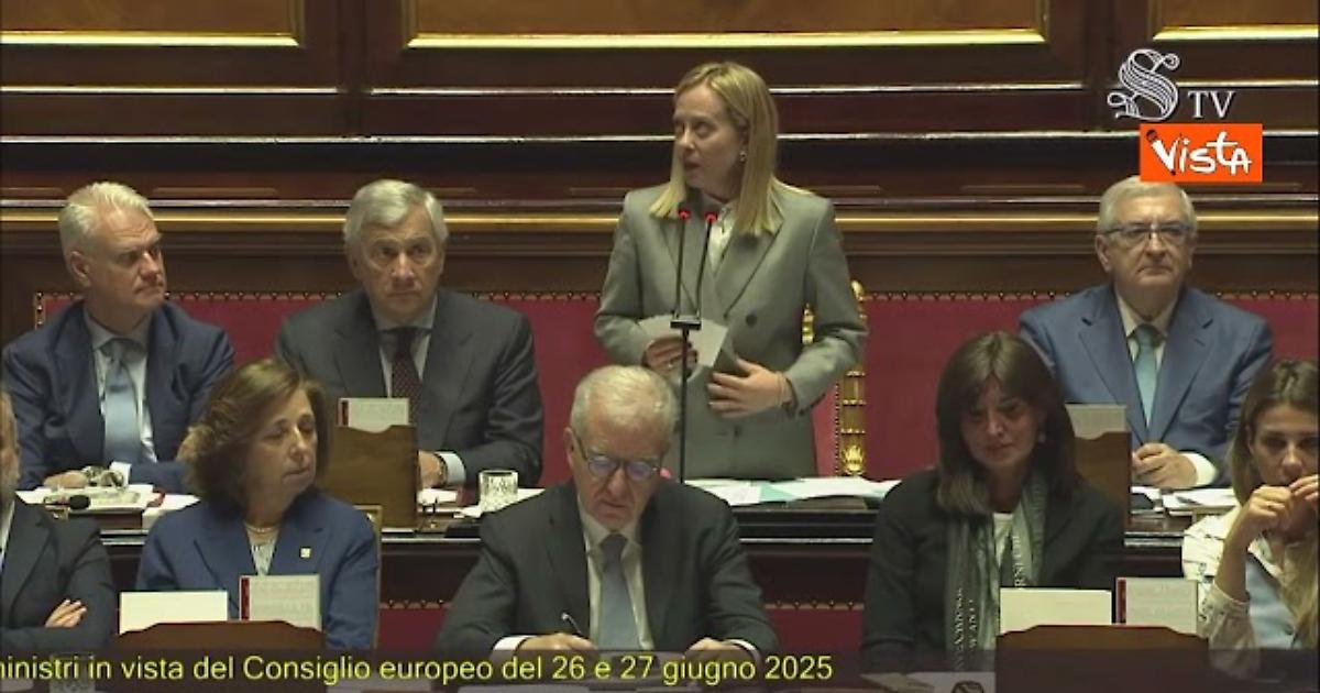 (Agenzia Vista) Roma, 24 giugno 2025 “Siamo ancora fiduciosi del fatto che si possa andare avanti con una tregua, che dalla tregua dalla tregua si possa tornare a quelle negoziazioni per le quali l'Italia ha lavorato fin dall'inizio.” Così la Presidente del Consiglio Giorgia Meloni, durante il suo intervento al Senato in vista del Consiglio europeo del 26 e 27 giugno. / Senato. Fonte: Agenzia Vista / Alexander Jakhnagiev