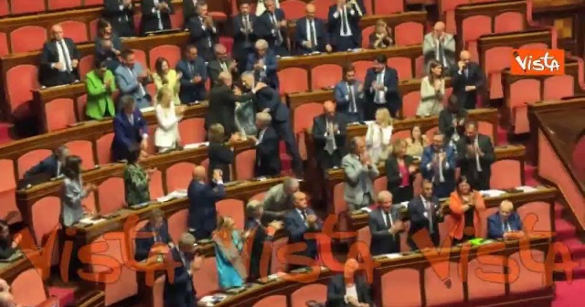 Standing ovation di FdI per la premier Meloni dopo l'intervento di Malan in Senato