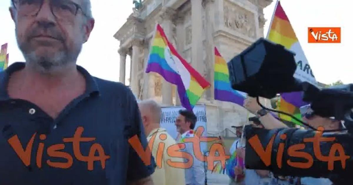 Il sindaco di Milano Giuseppe Sala riceve un ghiacciolo da un cittadino al Milano Pride .