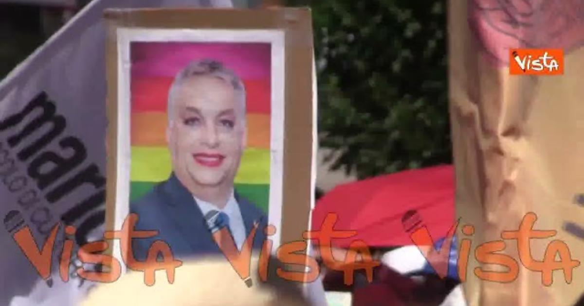 Budapest Pride, i cartelli del corteo, da Orban truccato con rossetto a 'Ursula do your job'