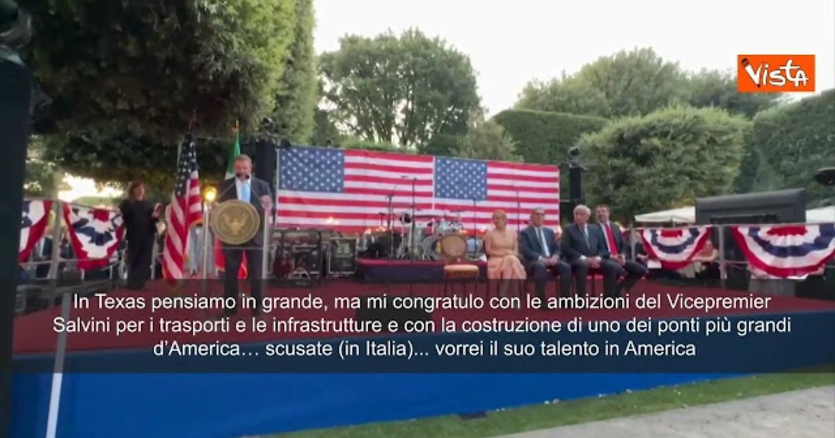 "In Texas pensiamo in grande, ma mi congratulo con le ambizioni del Vicepremier Salvini per i trasporti e le infrastrutture e con la costruzione di uno dei ponti più grandi d’America… scusate (in Italia)... vorrei il suo talento in America", il lapsus dell'ambasciatore Fertitta alla Festa del 4 Luglio a Roma.