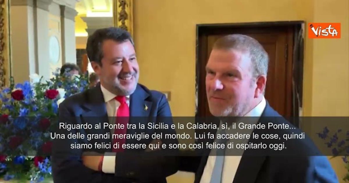 Il Ministro Salvini a Villa Taverna in occasione della festa del 4 luglio, l'Indipendenza americana, incontra l'Ambasciatore degli Stati Uniti in Italia Tilman J. Fertitta. "Ecco uno dei miei nuovi amici speciali. Ci siamo divertiti moltissimo insieme, parlando di tutto ciò su cui sta lavorando e del vostro grande Paese ed è stato un vero piacere conoscerlo per me. Riguardo al Ponte tra la Sicilia e la Calabria, sì, il Grande Ponte... Una delle grandi meraviglie del mondo. Lui fa accadere le cose, quindi siamo felici di essere qui e sono così felice di ospitarlo oggi", ha detto Fertitta.