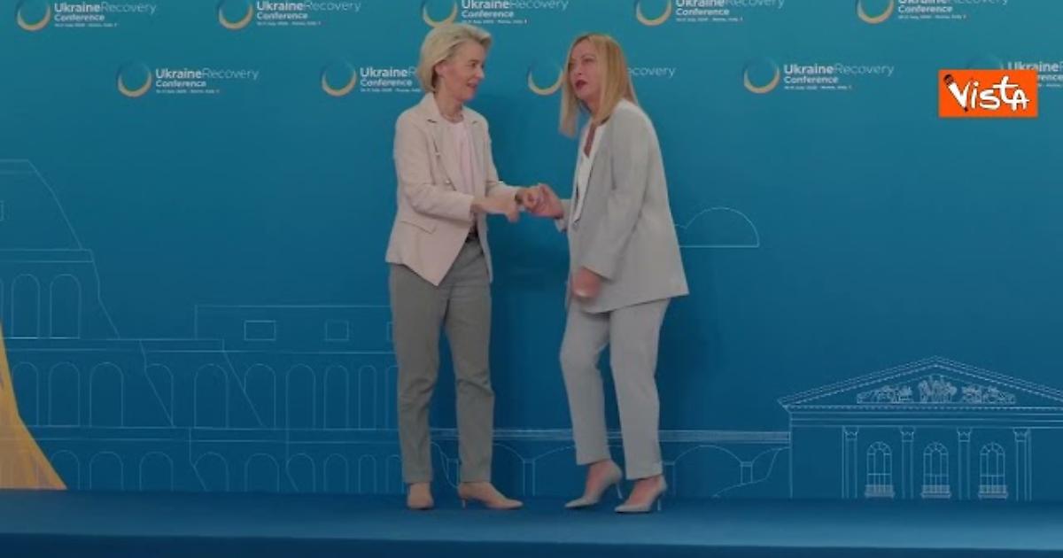 Abbraccio e baci sulle guance tra Meloni e von der Leyen a conferenza ricostruzione Ucraina
