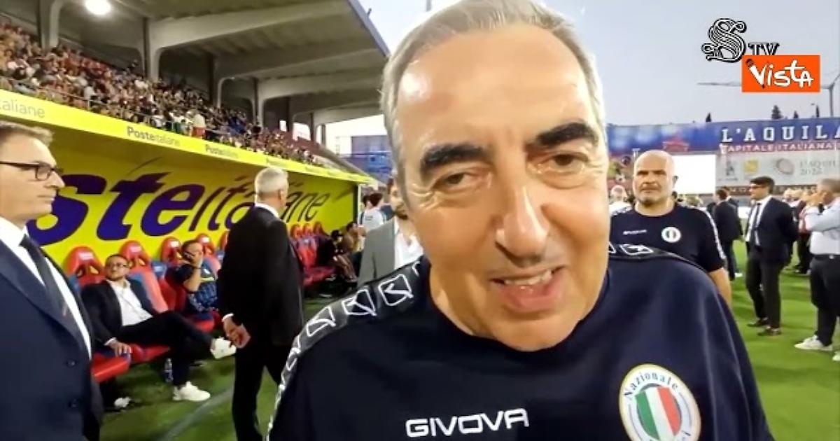 (Agenzia Vista) L'Aquila, 16 luglio 2025 "Dal punto di vista calcistico il livello è basso, ma c'è tanta solidarietà", così Gasparri alla Partita del Cuore politici vs cantanti all'Aquila. Senato Fonte: Agenzia Vista / Alexander Jakhnagiev