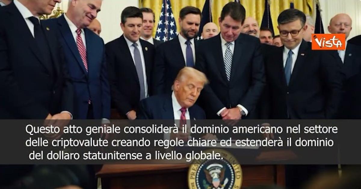 (Agenzia Vista) Washington, 19 luglio 2025 “Firmando lo storico Genius Act ho promesso che avremmo riportato la libertà e la leadership americana e reso gli Stati Uniti la capitale mondiale delle criptovalute, ed è ciò che abbiamo fatto. [...] Questo atto geniale consoliderà il dominio americano nel settore delle criptovalute creando regole chiare.” Così il presidente degli Stati Uniti Donald Trump. Fonte: Agenzia Vista / Alexander Jakhnagiev