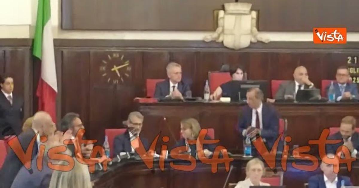 (Agenzia Vista) Milano, 21 luglio 2025 In occasione del consiglio comunale, l'assessore all'urbanistica del comune di Milano Giancarlo Tancredi si è dimesso dopo l'apertura dell'inchiesta sull'urbanistica che lo vede coinvolto. La stretta di mano tra Tancredi e il sindaco di Milano Giuseppe Sala. Fonte: Agenzia Vista / Alexander Jakhnagiev