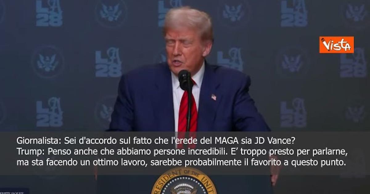 “Beh, penso che molto probabilmente, in tutta onestà, sia il vicepresidente JD Vance, sarebbe il favorito”. Così il Presidente degli Stati Uniti Donald Trump risponde a un giornalista che gli chiede chi sarebbe il miglior successore del movimento MAGA (Make America Great Again).