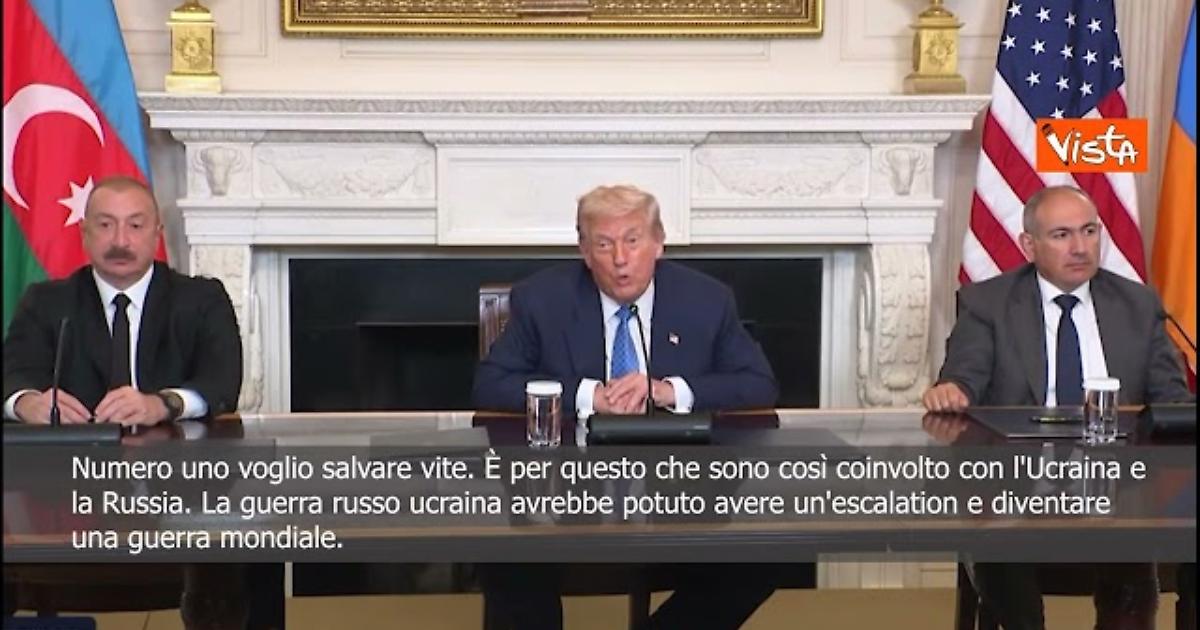 (Agenzia Vista) Washington, 08 agosto 2025 “La guerra russo ucraina avrebbe potuto avere un'escalation e diventare una guerra mondiale. Penso che se non fossimo intervenuti, la guerra tra Ucraina e sarebbe potuta diventare mondiale e io ho fermato tutto questo. .” Così il Presidente degli stati Uniti Donald Trump durante il trilaterale con Armenia e Azerbaijan. Courtesy: The White House Fonte: Agenzia Vista / Alexander Jakhnagiev