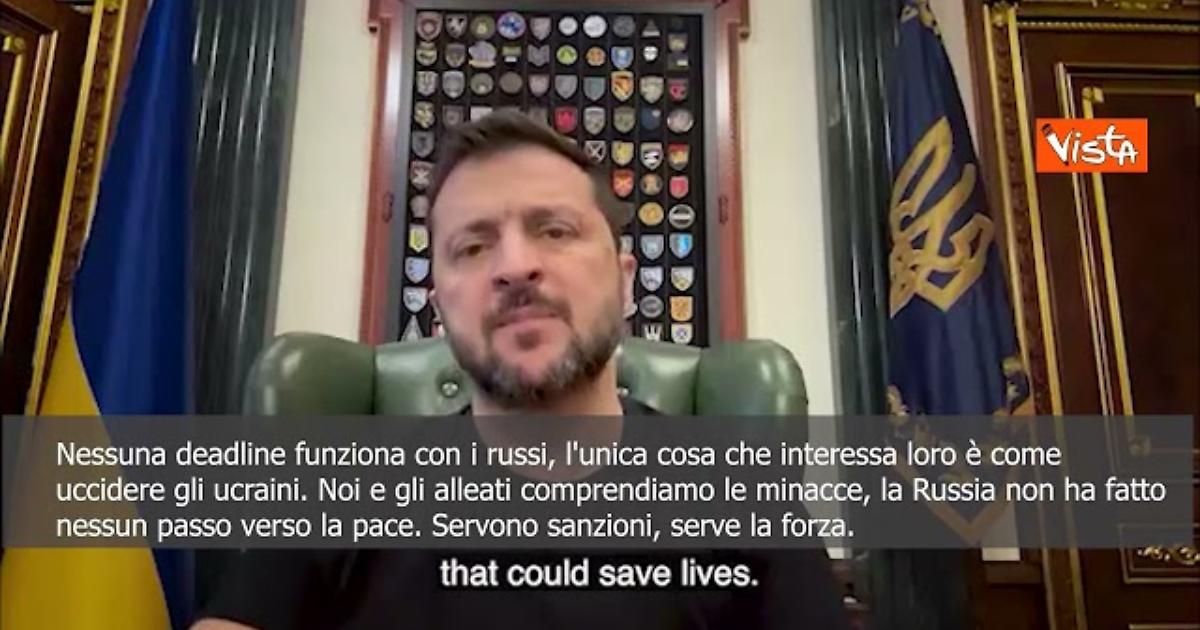 “Nessuna deadline funziona con i russi, l'unica cosa che interessa loro è come uccidere gli ucraini. Noi e gli alleati comprendiamo le minacce, servono sanzioni.” Così il Presidente ucraino Volodymyr Zelensky sul suo canale Telegram.