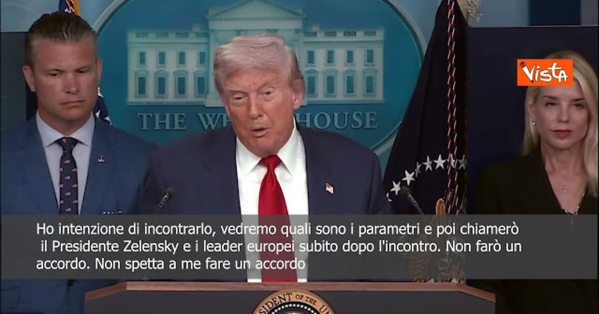 (Agenzia Vista) Washington, 11 agosto 2025 “Ma ho intenzione di incontrarlo, vedremo quali sono i parametri e poi chiamerò il Presidente Zelensky e i leader europei subito dopo l'incontro. Non farò un accordo. Non spetta a me fare un accordo.” Così il Presidente degli Stati Uniti Donald Trump nel corso di una conferenza stampa alla Casa Bianca. Courtesy: The White House Fonte: Agenzia Vista / Alexander Jakhnagiev