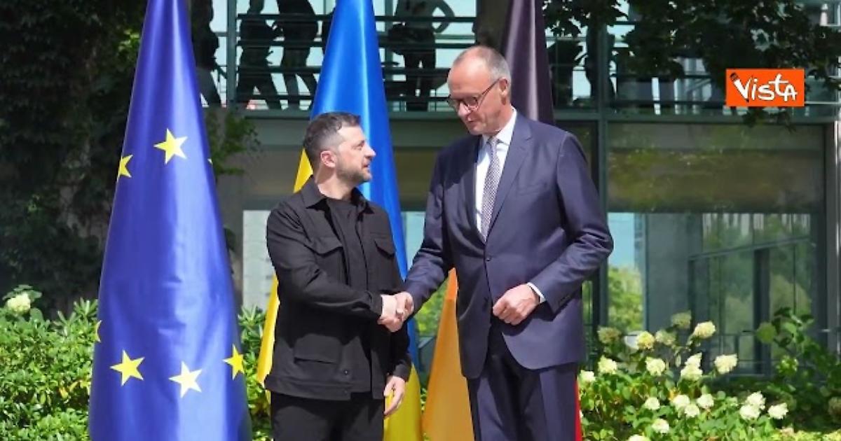 Il Presidente ucraino Volodymyr Zelensky è stato accolto dal cancelliere tedesco Friedrich Merz a Berlino, per partecipare insieme al colloquio online con il Presidente degli Stati Uniti Donald Trump e con il grupppo dei volenterosi, in vista dell'incontro tra quest'ultimo e il Presidente russo Vladimir Putin.
