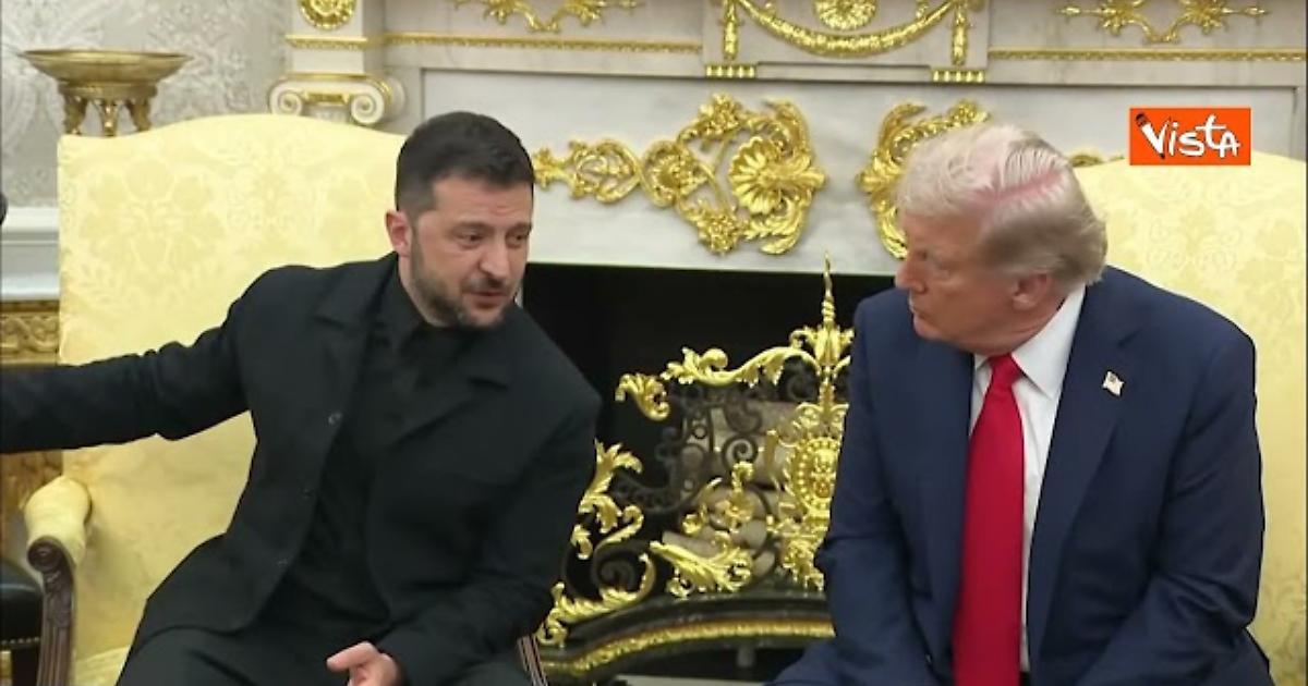 ll Presidente ucraino Volodymyr Zelensky consegna al Presidente statunitense Donald Trump una lettera scritta da sua moglie, Olena Zelenska, per la moglie di Trump, Melania nello studio ovale della Casa Bianca.