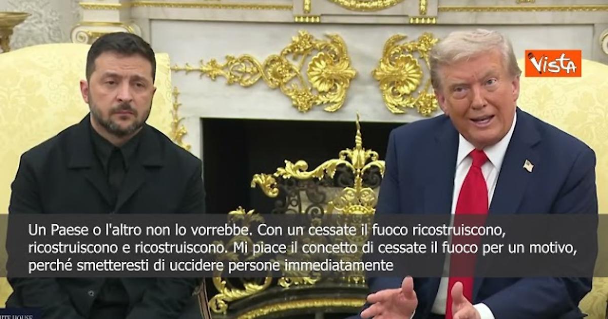 “Non credo che ci sia bisogno di un cessate il fuoco. Ho fatto accordi senza menzionare il cessate il fuoco. So che potrebbe essere una buona idea, posso anche capirne il motivo strategicamente. Beh, sai, un Paese o l'altro non lo vorrebbe perchè così ricostruiscono, ricostruiscono e ricostruiscono.” Così il Presidente statunitense Donald Trump, insieme al Presidente ucraino Volodymyr Zelensky nello studio ovale della Casa Bianca.