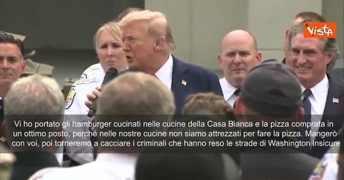 "Vi ho portato gli hamburger cucinati nelle cucine della Casa Bianca e la pizza comprata in un ottimo posto, perché nelle nostre cucine non siamo attrezzati per fare la pizza. Mangerò con voi, poi torneremo a cacciare i criminali che hanno reso le strade di Washington insicure", così Donald Trump tra gli uomini della Guardia Nazionale al lavoro per la sicurezza delle strade di Washington.