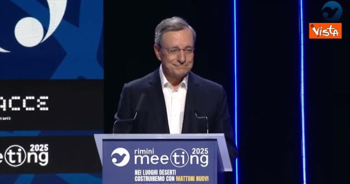 (Agenzia Vista) Rimini, 22 agosto 2025 L'ex premier Mario Draghi interviene sul palco del Meeting di Rimini, per lui un lungo applauso del pubblico. Meeting Rimini Fonte: Agenzia Vista / Alexander Jakhnagiev