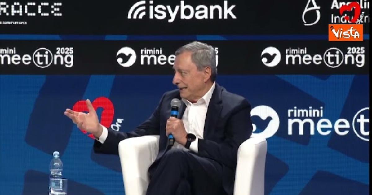 (Agenzia Vista) Rimini, 22 agosto 2025 "Scrissi la mia laurea sostenendo che la moneta unica era una gran sciocchezza... poi quando sono tornato in Italia dagli Usa negli anni Novanta ho visto che le condizioni dell'Europa erano molto cambiate, i paesi erano più vicini e forse valeva la pena di avere una moneta comune. Il mio è un europeismo pragmatico e coi piedi per terra" Così Draghi al Meeting di Rimini. Meeting Rimini Fonte: Agenzia Vista / Alexander Jakhnagiev
