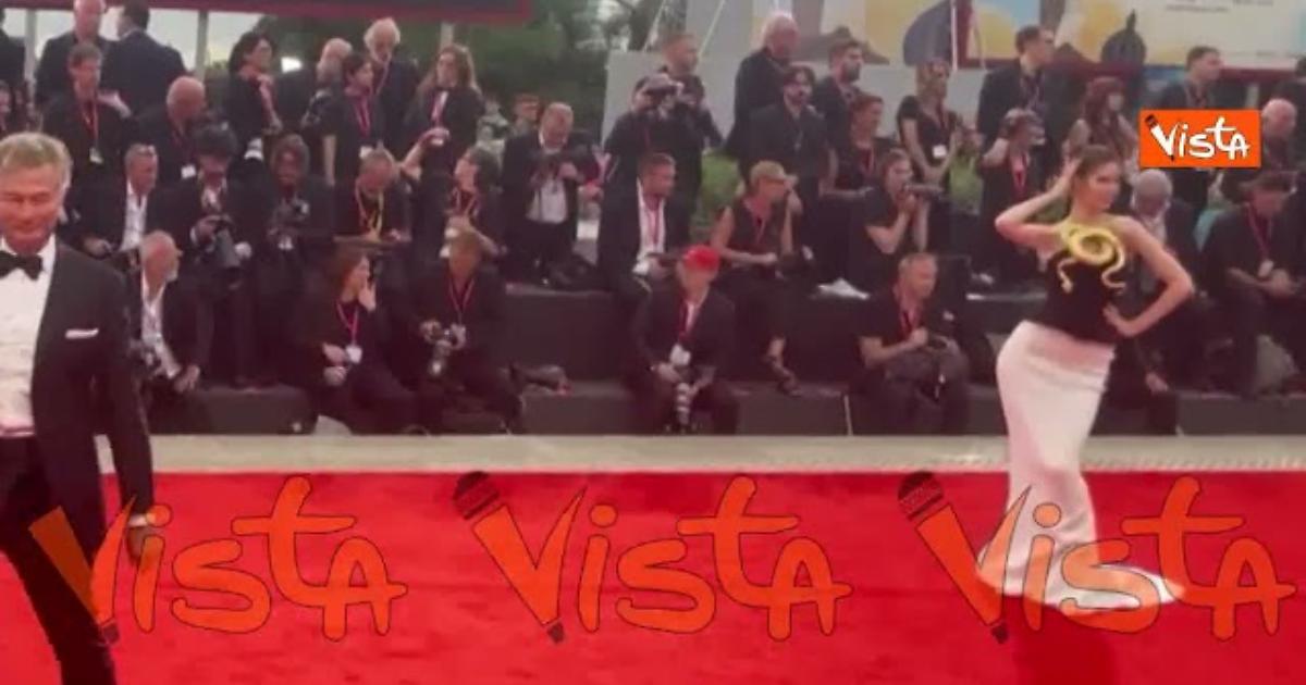 Venezia 82, una modella sfila sul red carpet con un abito decorato da un serpente dorato