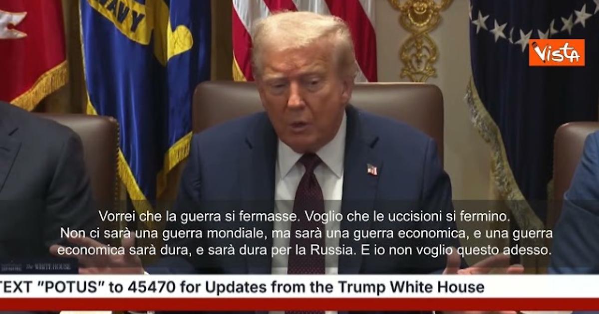 Vorrei che la guerra si fermasse. Voglio che le uccisioni si fermino. Non ci sarà una guerra mondiale, ma sarà una guerra economica, e una guerra economica sarà dura, e sarà dura per la Russia. E io non voglio questo adesso. Bisogna anche vedere come si comporterà Volodymyr Zelensky in futuro. Non è esattamente innocente neanche lui... ci vogliono due persone per ballare il tango, e lo dico sempre, bisogna mettere insieme le parti", lo h detto il Presidente Usa Donald Trump durante la riunione di gabinetto.