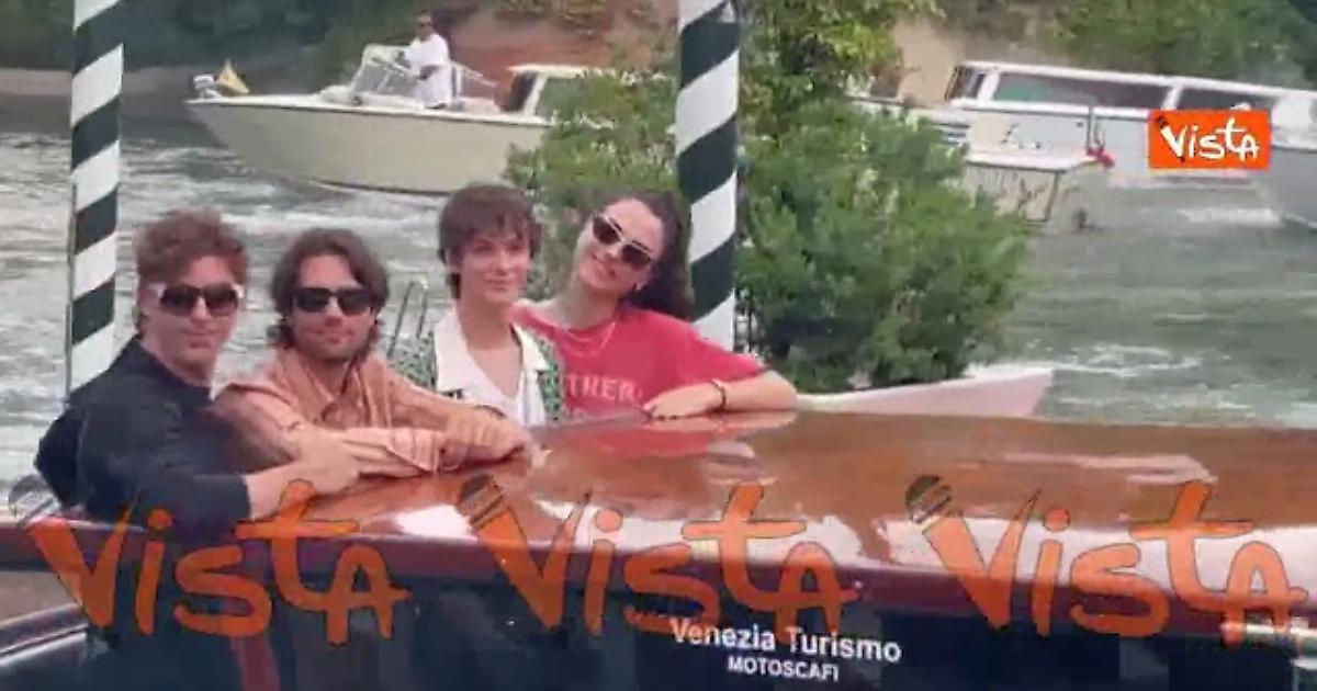 Michele Riondino, Paolo Strippoli, Giulio Feltri e Romana Maggiora Vergano arrivano al Lido a bordo di un taxi acqueo per presentare il film La valle dei sorrisi diretto da Paolo Strippoli.