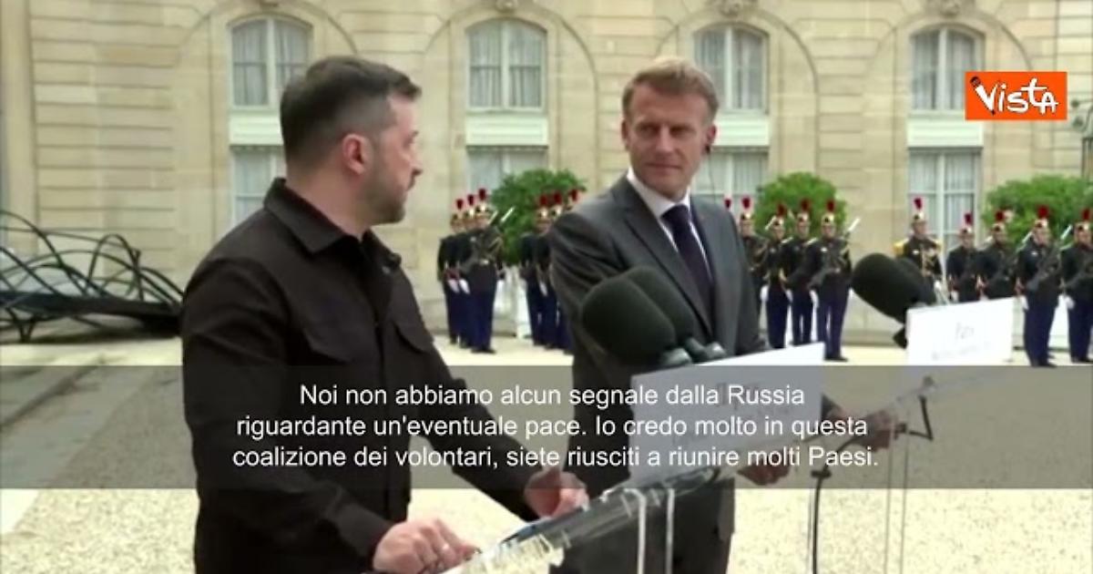 "Noi non abbiamo alcun segnale dalla Russia riguardante un'eventuale pace. Io credo molto in questa coalizione dei volontari, siete riusciti a riunire molti Paesi". Lo ha detto il presidente ucraino, Volodymyr Zelensky, parlando questa sera al fianco di Emmanuel Macron nel cortile dell'Eliseo.