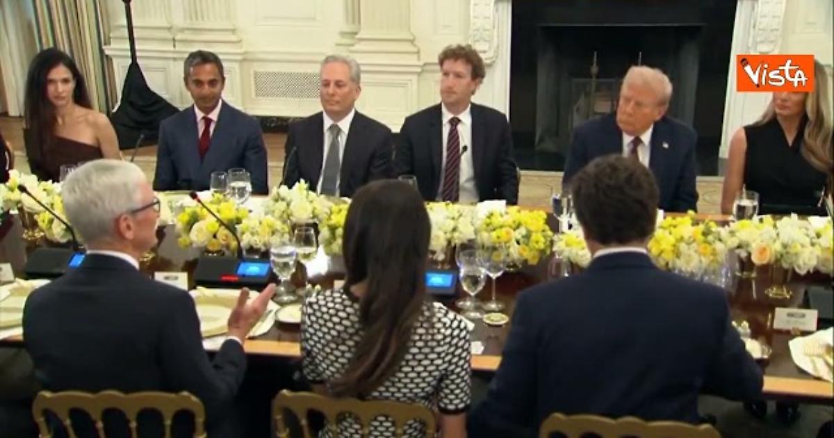 (Agenzia Vista) Usa, 05 settembre 2025 Donald e Melania Trump hanno ricevuto alla Casa Bianca i leader delle Big Tech per parlare di intelligenza artificiale. Presenti tra gli altri, presenti Tim Cook, Bill Gates, Mark Zuckerberg e Safra Catz. Manca Elon Musk, che ha mandato un suo collaboratore. X Fonte: Agenzia Vista / Alexander Jakhnagiev