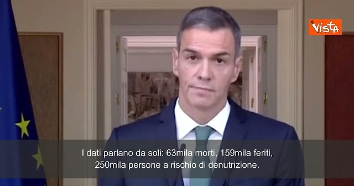 "Il Governo di Spagna ritiene che una cosa è difendere il tuo Paese e la tua società, mentre cosa ben diversa è bombardare ospedali e far morire di fame bambini innocenti. Quel che il premier Netanyahu aveva presentato nell'ottobre del 2023 come una risposta agli atroci attentati terroristici di Hamas, ha finito per diventare un nuova ondata di occupazioni illegali, in un attacco ingiustificato contro la popolazione civile palestinese. Un attacco che la relatrice speciale dell'Onu come anche la maggior parte degli esperti definiscono un genocidio. I dati parlano da soli: 63mila morti, 159mila feriti, 250mila persone a rischio di denutrizione. E quasi 2 milioni di persona scacciate dalla loro terra, metà delle quali minorenni. Questo non è difendersi e nemmeno attaccare. Questo è sterminare un popolo indifeso e violare tutte le norme del diritto internazionale" così il primo ministro spagnolo Pedro Sànchez in un messaggio alla sua nazione.