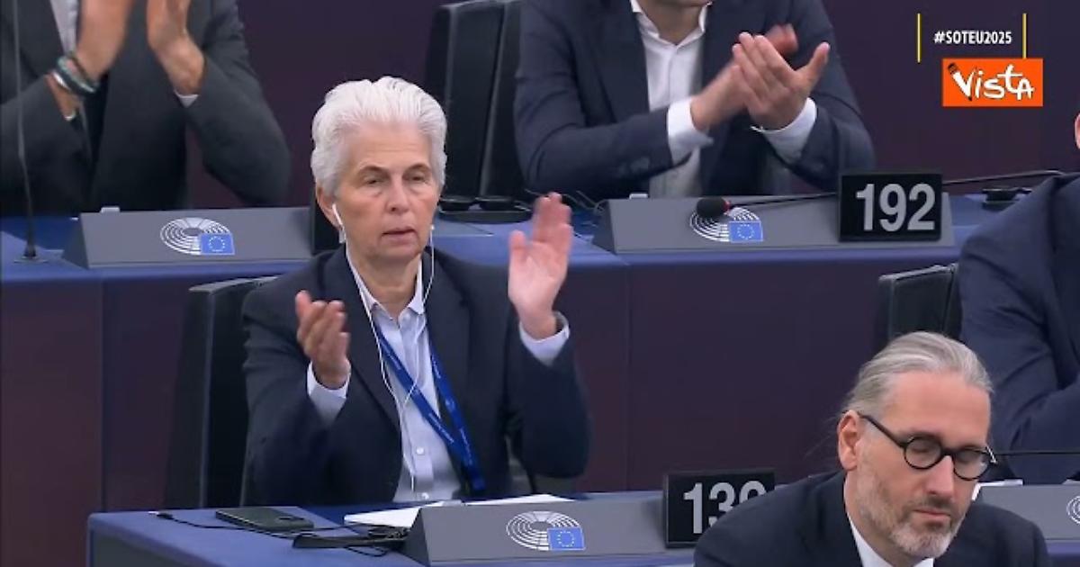 (Agenzia Vista) Strasburgo, 10 settembre 2025 "Proprio oggi abbiamo assistito a una violazione sconsiderata e senza precedenti dello spazio aereo polacco ed europeo da parte di più di 10 droni russi Shahid. L'Europa è pienamente solidale con la Polonia" così la Presidente della Commissione Europea Ursula Von Der Leyen nel corso del discorso sullo Stato dell'Unione. Courtesy: Ebs Fonte: Agenzia Vista / Alexander Jakhnagiev