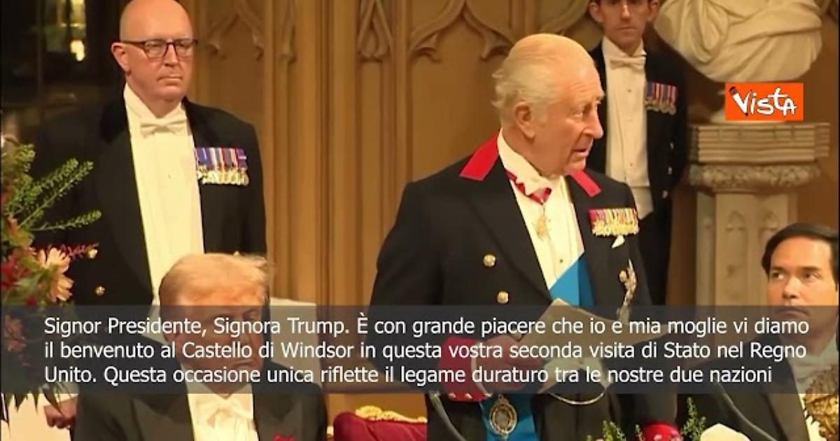 "Signor Presidente, Signora Trump. È con grande piacere che io e mia moglie vi diamo il benvenuto al Castello di Windsor, in questa vostra seconda visita di Stato nel Regno Unito. Questa occasione unica e importante riflette il legame duraturo tra le nostre due grandi nazioni, ancorato alla profonda amicizia tra i nostri popoli." Così Re Carlo III del Regno Unito, durante un banchetto di Stato con il Presidente degli Stati Uniti Donald Trump al Castello di Windsor.