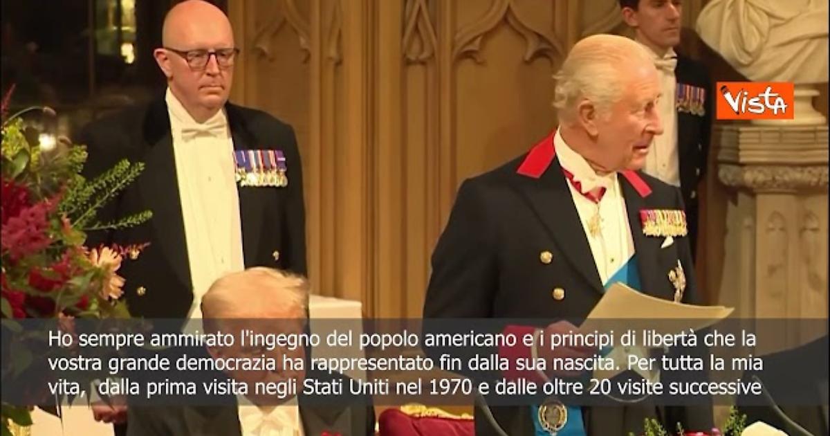 "Da parte mia, ho sempre ammirato l'ingegno del popolo americano e i principi di libertà che la vostra grande democrazia ha rappresentato fin dalla sua nascita." Così Re Carlo III del Regno Unito, durante un banchetto di Stato con il Presidente degli Stati Uniti Donald Trump al Castello di Windsor.