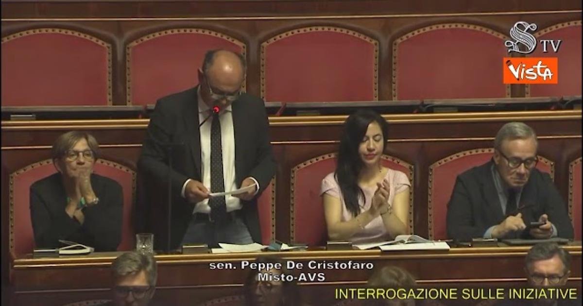 (Agenzia Vista) Roma, 18 settembre 2025 “L'abbiamo appreso pochi minuti fa, da un'anteprima di Piazza Pulita, nel settembre 2024, con la strage di Gaza ben in corso purtroppo da un anno, lei dichiarava, è un virgolettato, si dichiarava contrario ad ogni proposta di Stato palestinese. Allora Ministro io penso davvero che su questa cosa ci voglia una serietà, perché proprio l'ipocrisia davvero insopportabile dinanzi a quello che sta accadendo drammaticamente in quel territorio.” Così il deputato di Alleanza Verdi e Sinistra, Peppe De Cristofaro, durante il Question Time in Senato. / Senato Fonte: Agenzia Vista / Alexander Jakhnagiev