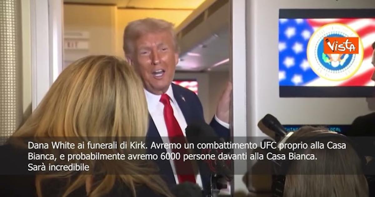 (Agenzia Vista) Washington, 21 settembre 2025 “Avremo un combattimento UFC proprio alla Casa Bianca, e probabilmente avremo 6000 persone davanti alla Casa Bianca. Sarà incredibile.” Così il Presidente degli Stati Uniti Donald Trump sull'Air Force One dopo aver partecipato al funerale di Charlie Kirk, ucciso nel campo universitario dello Utah. Cortesy: The White House Fonte: Agenzia Vista / Alexander Jakhnagiev