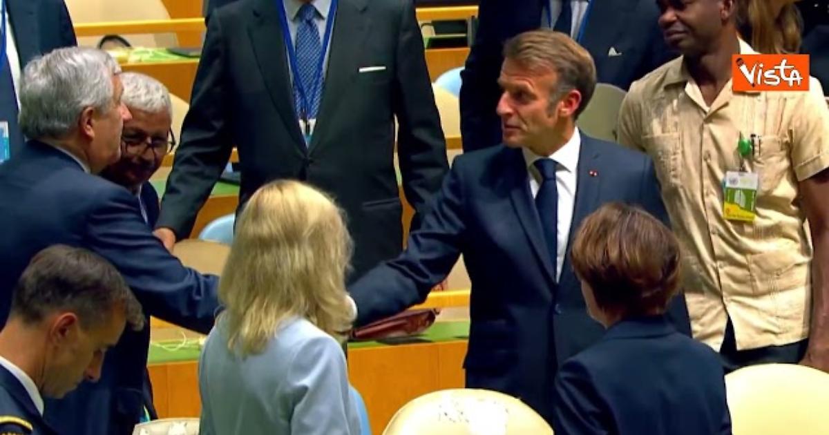Il Presidente francese Emmanuel Macron al suo arrivo all'Assemblea generale dell'Onu a New York saluta gli altri leader con strette di mano. Tra questi, c'è anche il Ministero degli esteri italiano Antonio e Tajani.