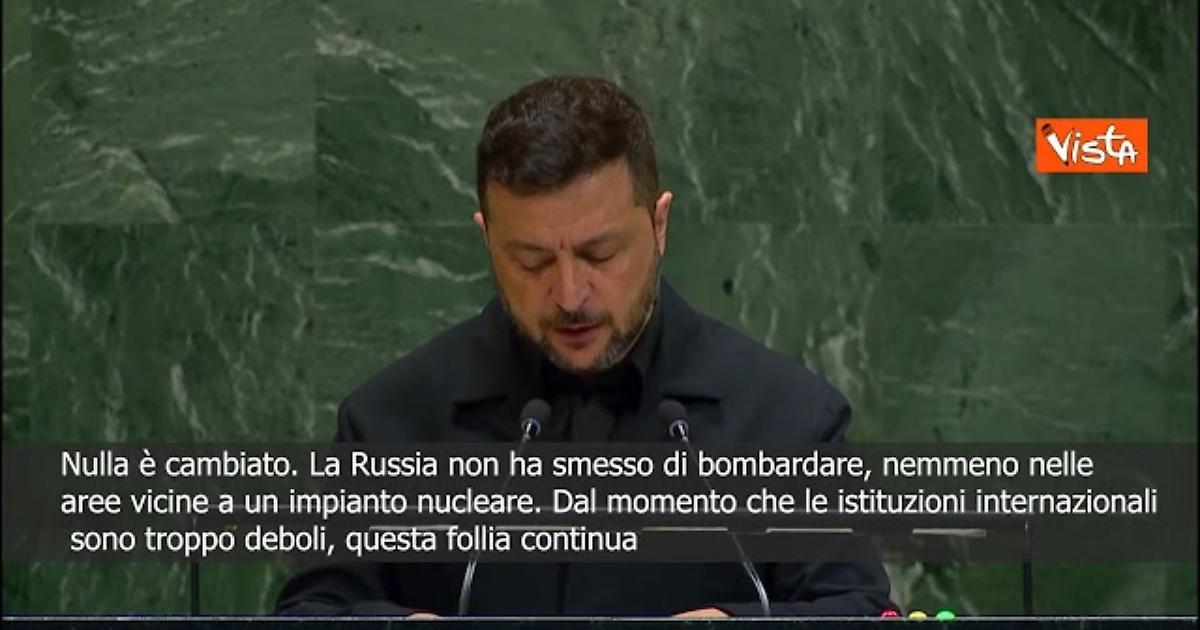 (Agenzia Vista) New York, 24 settembre 2025 “Nulla è cambiato. La Russia non ha smesso di bombardare, nemmeno nelle aree vicine a un impianto nucleare. Dal momento che le istituzioni internazionali sono troppo deboli, questa follia continua.” Così il Presidente ucraino Volodymyr Zelensky, durante il suo intervento all'Assemblea generale dell'Onu, a New York. Courtesy: Un tv Fonte: Agenzia Vista / Alexander Jakhnagiev