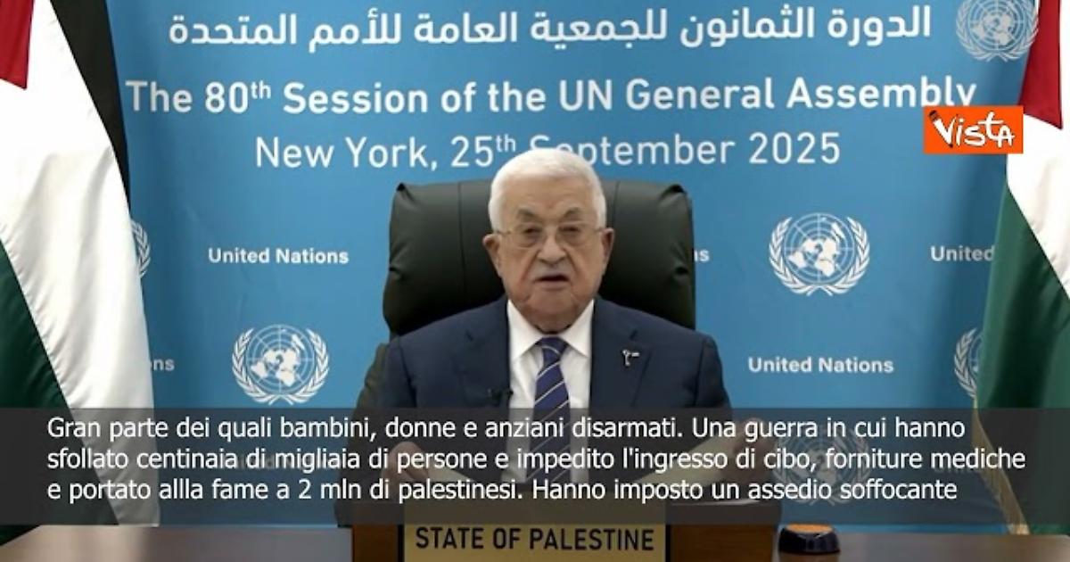 (Agenzia Vista) New York, 25 settembre 2025 “Ciò che Israele sta perpetrando non è semplicemente un'aggressione, è un crimine di guerra, un crimine contro l'umanità documentato e monitorato.” Così il Presidente della Palestina, Mahmoud Abbas, durante il suo intervento all'Assemblea generale dell'Onu, a New York. Courtesy: Un tv Fonte: Agenzia Vista / Alexander Jakhnagiev