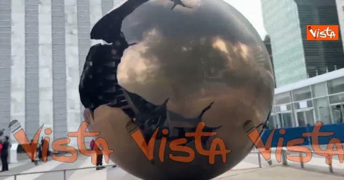 (Agenzia Vista) Usa, 25 settembre 2025 Ecco la “Sfera con Sfera” di Arnaldo Pomodoro davanti alla sede dell'Onu, a New York. Fonte: Agenzia Vista / Alexander Jakhnagiev