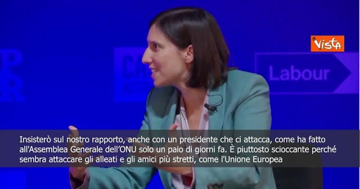“Insisterò sul nostro rapporto, anche con un presidente che ci attacca, come ha fatto all'Assemblea Generale delle Nazioni Unite solo un paio di giorni fa. È piuttosto scioccante perché sembra attaccare gli alleati e gli amici più stretti, come l'Unione Europea.” Così la Segretaria del partito Democratico, Elly Schlein, durante il suo intervento al 'Global Progress action Summit 2025”, il summit mondiale del progressismo riformista, a Londra.