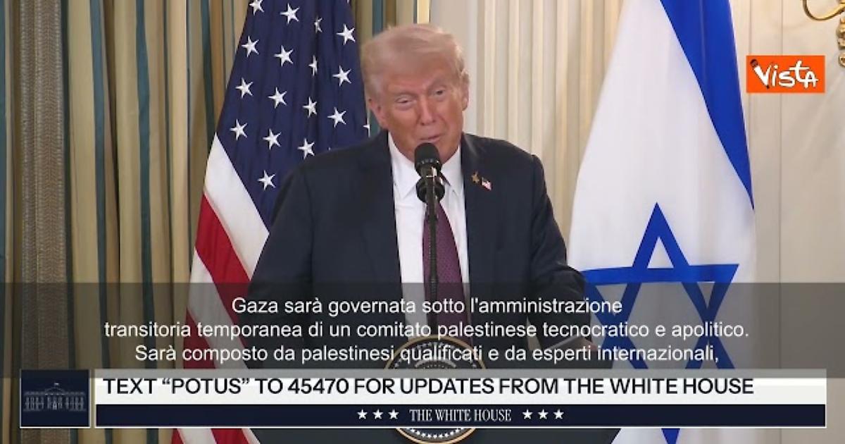 (Agenzia Vista) Usa, 30 settembre 2025 "Gaza sarà governata sotto l'amministrazione transitoria temporanea di un comitato palestinese tecnocratico e apolitico. Sarà composto da palestinesi qualificati e da esperti internazionali, con un nuovo organismo transitorio internazionale, il "Board of Peace", presieduto da me insieme ad altri membri, incluso l'ex Primo Ministro Tony Blair". Lo ha detto Donald Trump a fianco del premier israeliano Bibi Netanyahu. White House Fonte: Agenzia Vista / Alexander Jakhnagiev