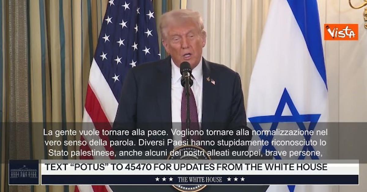 (Agenzia Vista) Usa, 29 settembre 2025 "La gente vuole tornare alla pace. Vogliono tornare alla normalizzazione nel vero senso della parola. Diversi Paesi hanno stupidamente riconosciuto lo Stato palestinese, anche alcuni dei nostri alleati europei, brave persone, ma in realtà, credo, lo fanno perché sono molto stanchi di ciò che va avanti da tanti decenni. Sono Presidenti e Primi ministri da anni, e in questo periodo tutto ciò che fanno è parlare sempre della stessa cosa", così il Presidente Usa Donald Trump a fianco del premier israeliano Netanyahu. White House Fonte: Agenzia Vista / Alexander Jakhnagiev