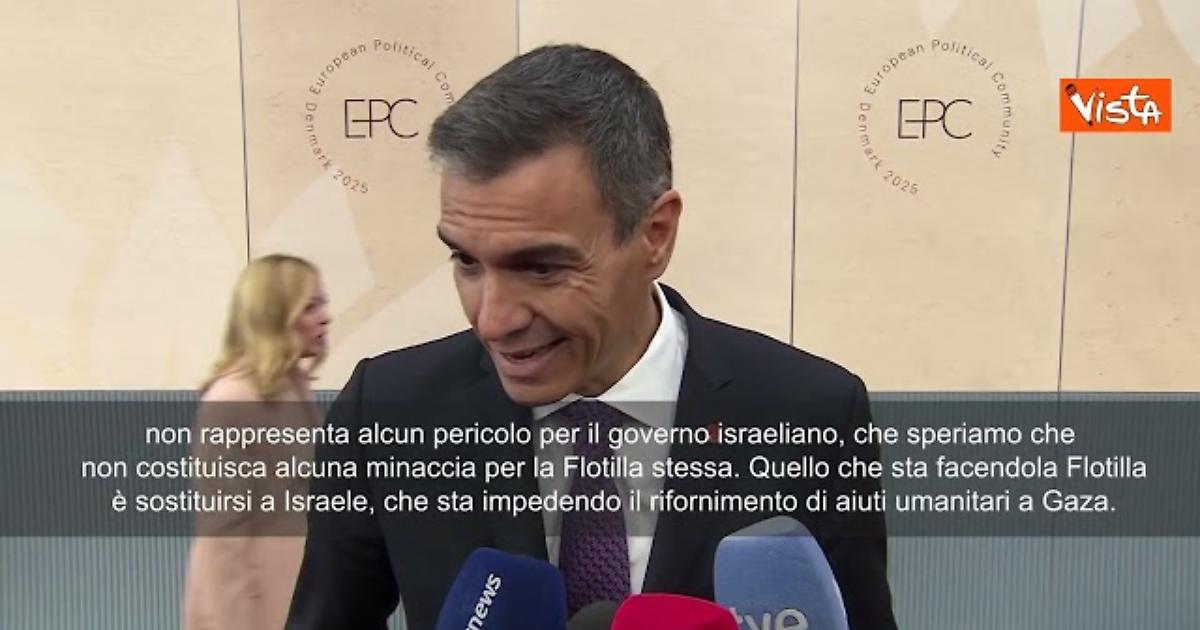 (Agenzia Vista) Danimarca, 02 ottobre 2025 “Garantiremo la protezione diplomatica ai nostri cittadini e senza alcun dubbio la protezione dei diritti che potranno essere compromessi dall’azione del governo israeliano. Come ho detto in molte occasioni, la Flotilla non rappresenta alcun pericolo per il governo israeliano, che speriamo che non costituisca alcuna minaccia per la Flotilla stessa. Quello che sta facendola Flotilla è sostituirsi a Israele, che sta impedendo il rifornimento di aiuti umanitari a Gaza. Credo che si debba riconoscere e applaudire quella solidarietà che esprime la società spagnola e molte altre, perché stiamo parlando di una flottiglia che rappresenta più di 40 nazionalità, più di mille partecipanti”. Così il Primo ministro spagnolo Pedro Sanchez a margine del vertice Ue che si sta tenendo in questi giorni a Copenaghen. Ebs Fonte: Agenzia Vista / Alexander Jakhnagiev