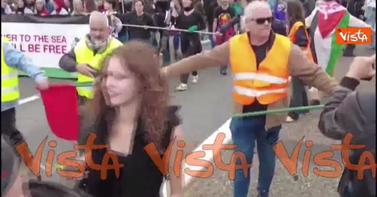 Il corteo di manifestanti in sostegno della Global Summud Flotilla arriva sulla tangenziale est di Milano