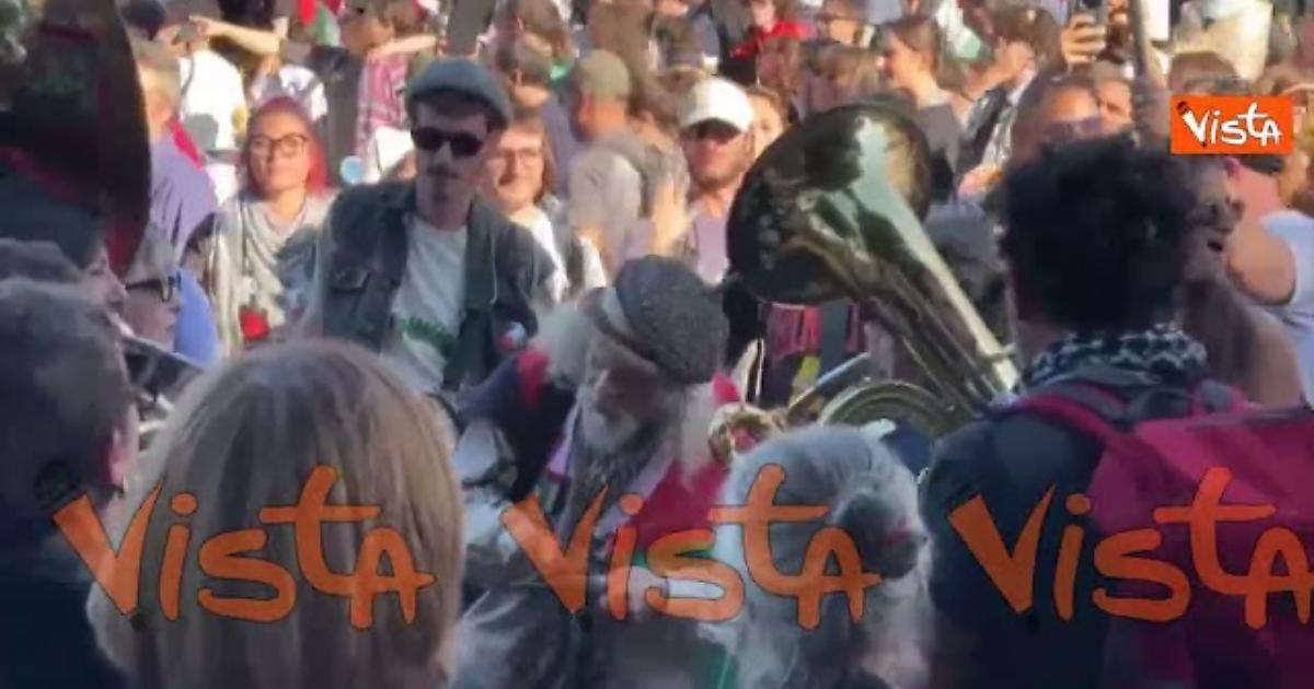 Musicisti suonano in strada con bandiere Palestina e kefiah al corteo pro Gaza a Roma. In migliaia sono scesi in piazza all'indomani dello sciopero generale per la Flotilla