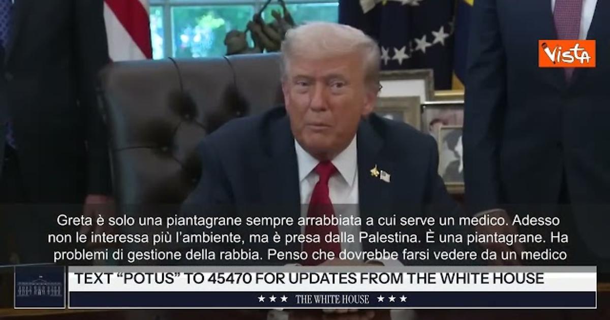 (Agenzia Vista) Usa, 07 ottobre 2025 “Greta è solo una piantagrane sempre arrabbiata a cui serve un medico. Adesso non le interessa più l’ambiente, ma è presa dalla Palestina. È una piantagrane. Ha problemi di gestione della rabbia. Penso che dovrebbe farsi vedere da un medico”. Così dallo Studio Ovale il Presidente Usa Donald Trump ha parlato di Greta Thunberg, dopo la partecipazione dell’attivista svedese alla missione della Flotilla. White House Fonte: Agenzia Vista / Alexander Jakhnagiev
