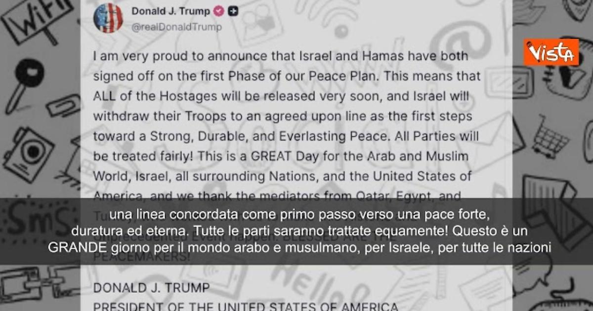 (Agenzia Vista) Usa, 09 ottobre 2025 "Sono molto orgoglioso di annunciare che Israele e Hamas hanno entrambi firmato la prima fase del nostro Piano di pace. Ciò significa che TUTTI gli ostaggi verranno rilasciati molto presto e Israele ritirerà le proprie truppe secondo una linea concordata come primo passo verso una pace forte, duratura ed eterna. Tutte le parti saranno trattate equamente! Questo è un GRANDE giorno per il mondo arabo e musulmano, per Israele, per tutte le nazioni circostanti e per gli Stati Uniti d’America, e ringraziamo i mediatori del Qatar, dell’Egitto e della Turchia, che hanno lavorato con noi per realizzare questo evento storico e senza precedenti. BEATI I PACIFICI! DONALD J. TRUMP PRESIDENTE DEGLI STATI UNITI D'AMERICA", lo ha scritto Trump su Truth. Truth Fonte: Agenzia Vista / Alexander Jakhnagiev